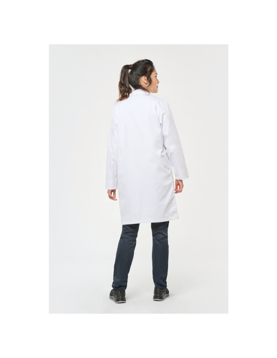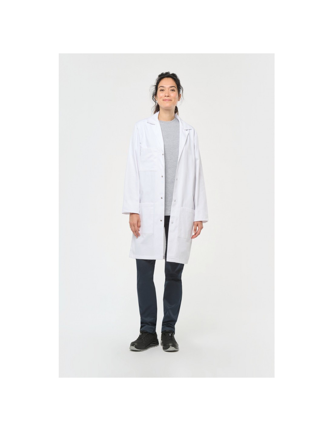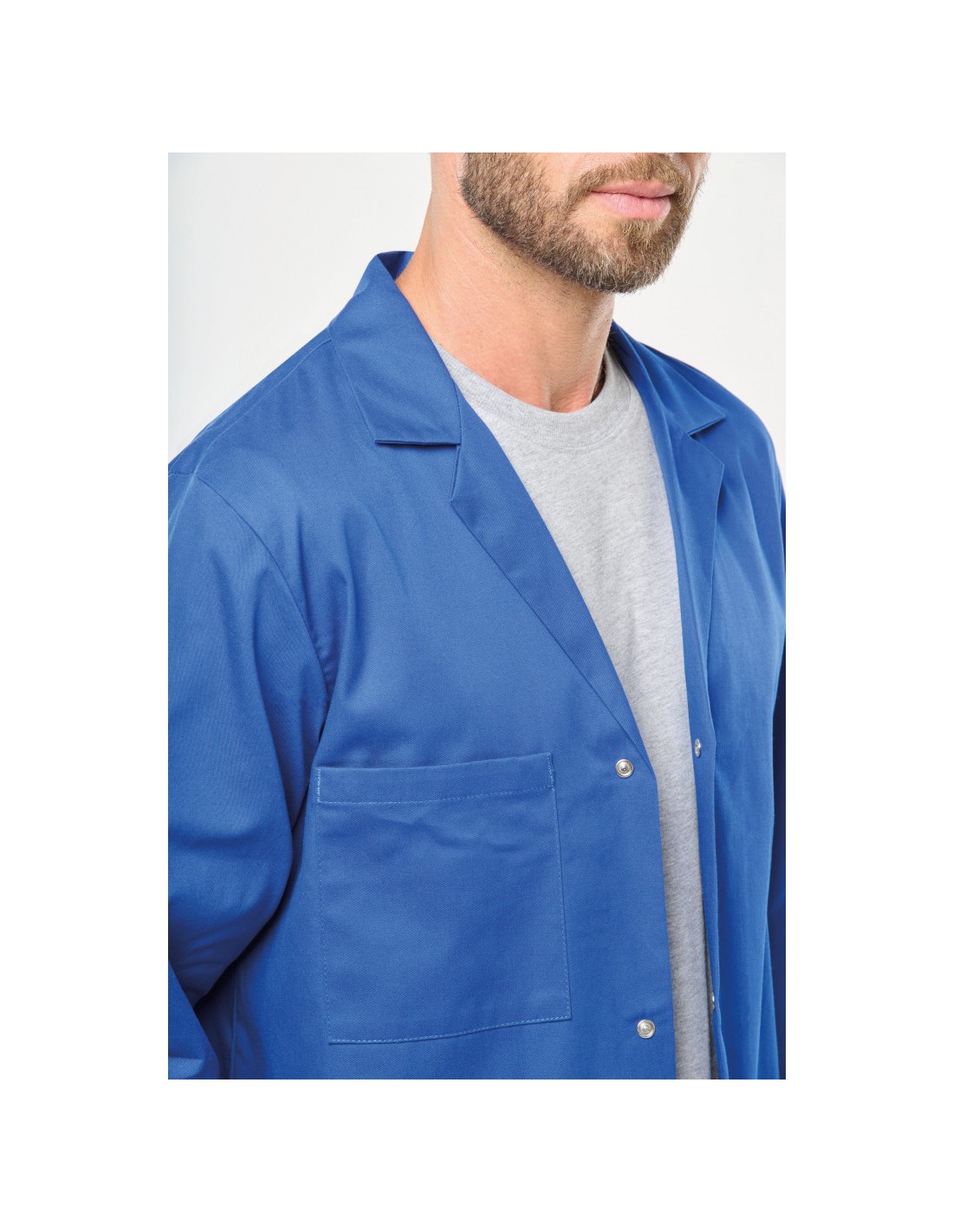 Forme générale Col ouvert. Fermeture devant par 4 boutons pression. 2 poches plaquées ouverte devant + 1 poche poitrine ouverte côté droit. Boucle d'accrochage intérieur col. Certifié STANDARD 100 by OEKO-TEX®N° CQ1007/8, IFTH.