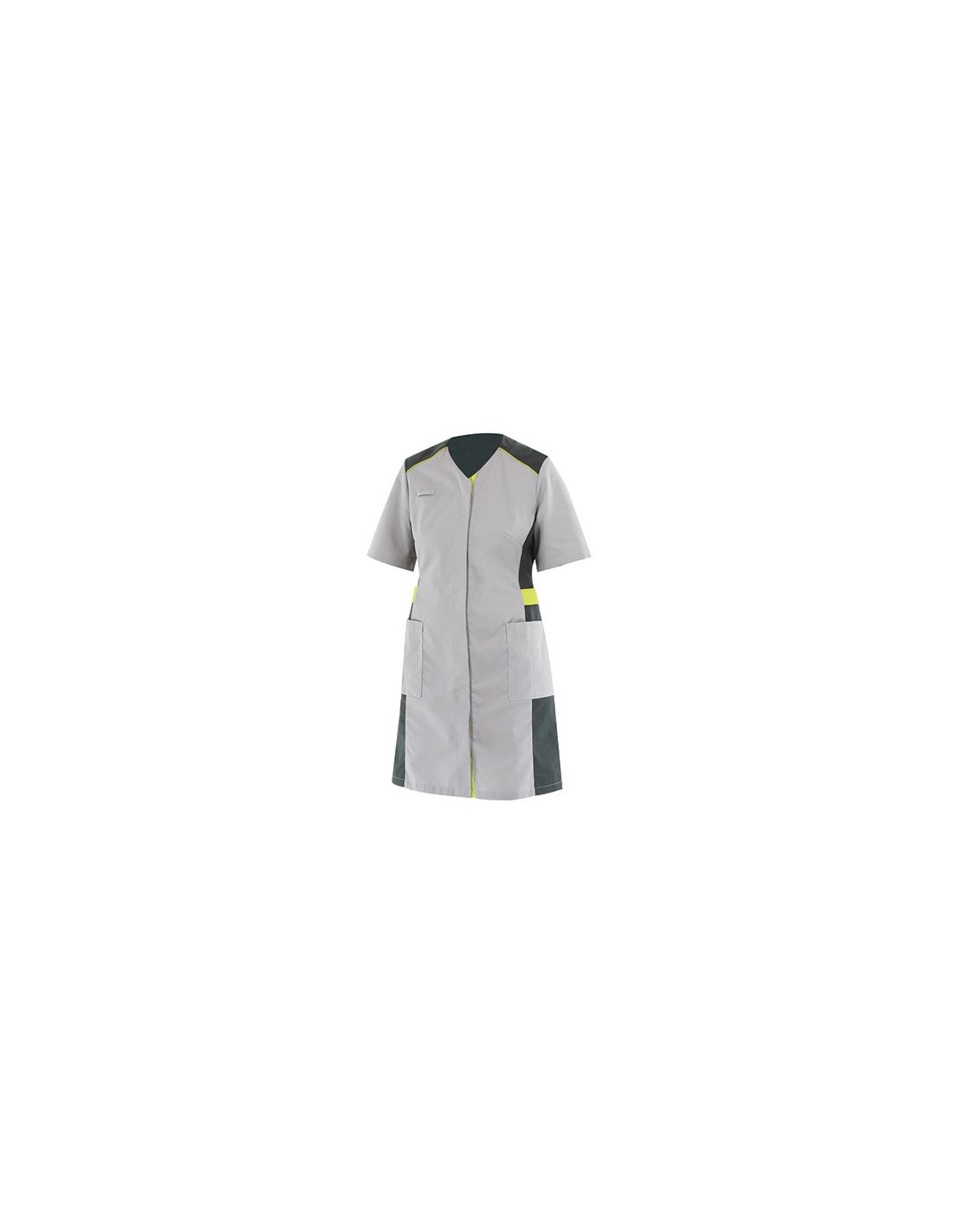 Forme générale Blouse manches courtes, encolure V, fermeture devant par grippers cachés, pinces poitrine, 1 passant porte-bip sur poitrine, 2 poches basses plaquées, taille réglable par pattes de cotés, collerette de marquage