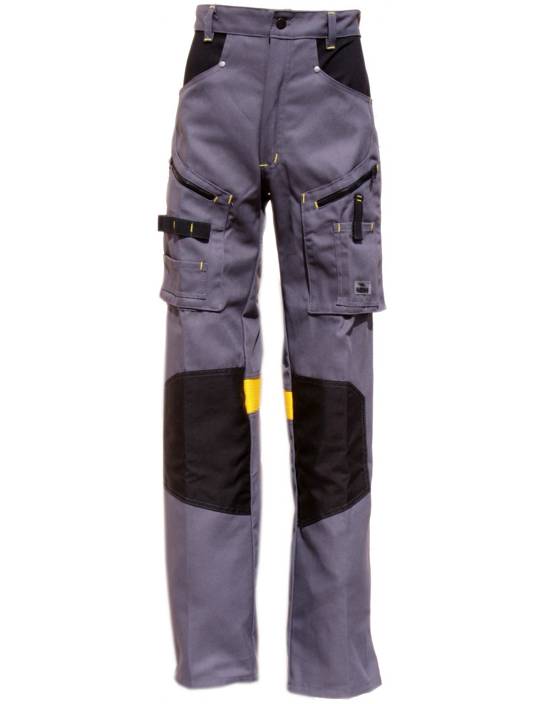 2 poches cavalières avec sac de poches coloris contrasté, 2 poches arrières plaquées, 2 poches cuisses 3 soufflets fermées par glissière, 1 poche téléphone fermée par sangle velcro sur cuisse gauche, sangle porte outils sur cuisse droite et 1 anneau porte clefs, emplacements porte genouillères