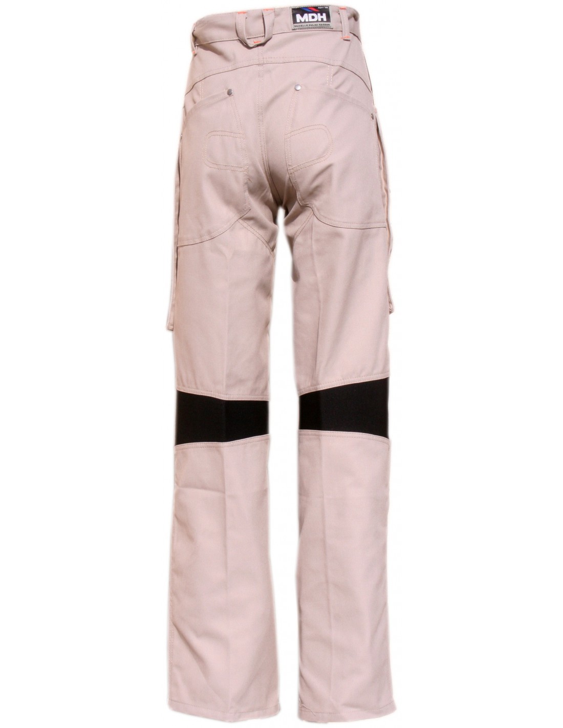 Forme générale Pantalon ceinture 6 passants fermeture par bouton rivet, braguette à glissière sous rabat, réhausse de protection lombaires, bord côte d'aisanse sur arrière genoux