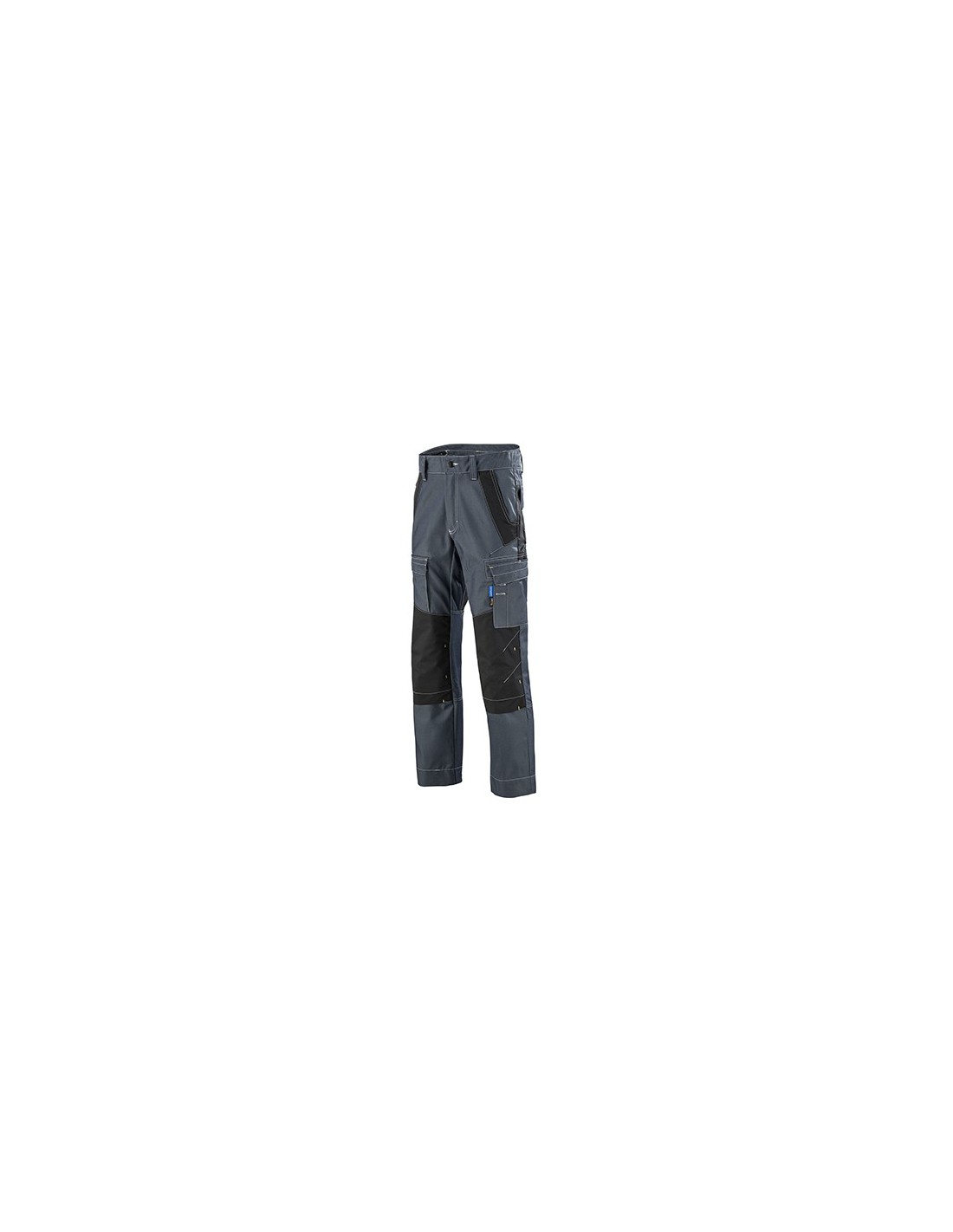 Forme générale Ceinture élastique intérieur dos fermée par bouton, 5 passants ceinture, fermeture glissière sous rabat, dos protège reins, découpe mis-jambes dos, 2 poches à l'italienne plus poche ticket, 1 poche cuisse à soufflet fermée, 3 boutonnières porte stylo, 2 poches arrière à rabats fermés, 1 sangle porte marteau, empiècement d'aisance à l'entrejambe, renforts sur les zones de contact soumise au frottement entrées de poches, arrière dos et cheville, emplacements poches genouillères fermées par auto agrippant, mercerie tout plastique