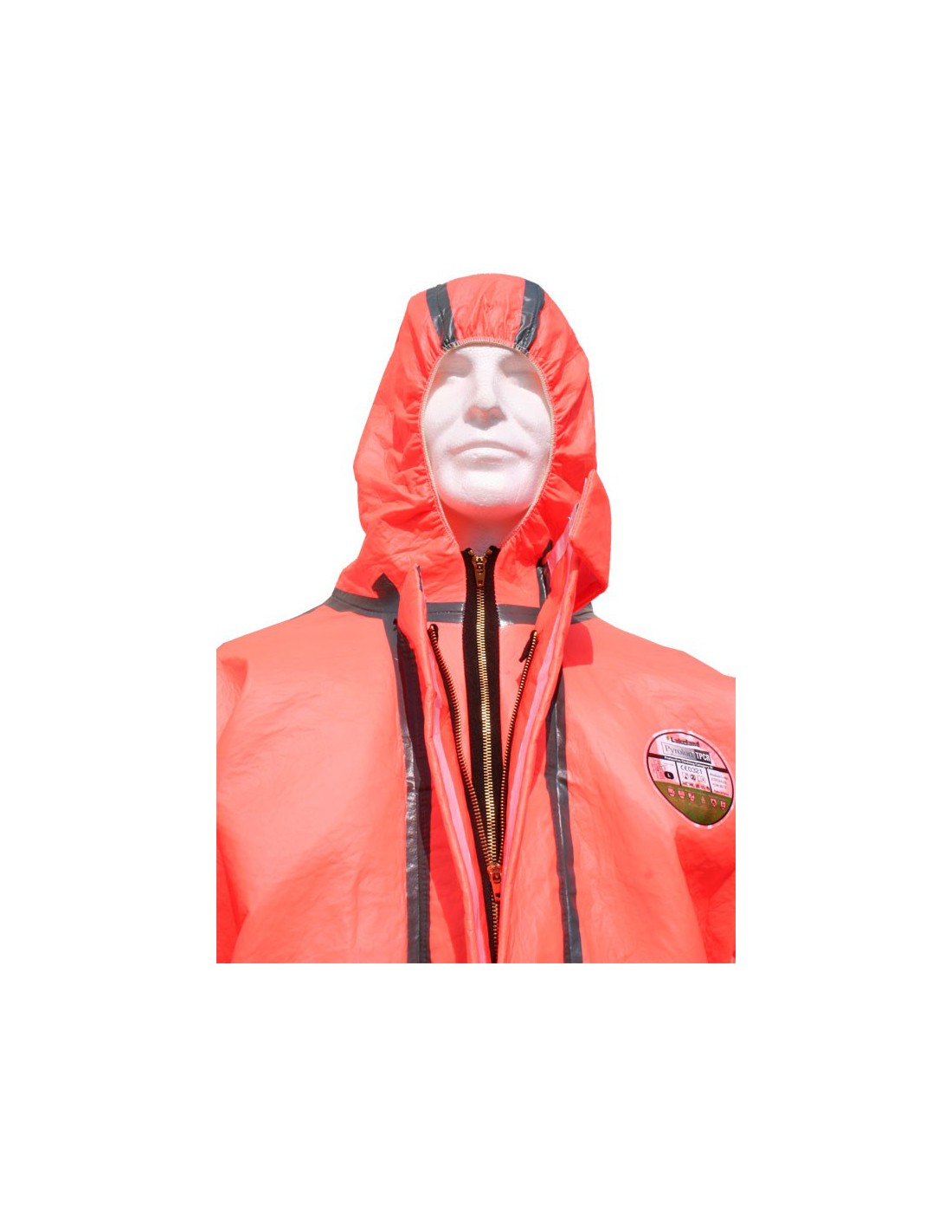 | Détails de forme | Capuche élastiquée conçue pour un ajustement serré autour du masque facial, fermeture double glissière couverte par un rabat adhésif jusqu'au menton, serrage taille par élastique dos, élastique poignets et chevilles, encart d'emmanchures et soufflet d'entrejambes pour une plus grande liberté de mouvements, genoux renforcés |