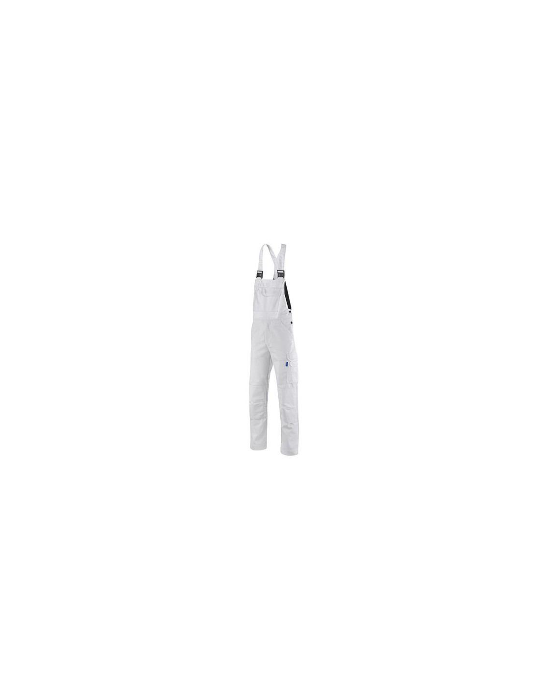 Forme générale Bretelles élastiquées dos réglables par boucles pvc, fermeture latérale par double boutonnage, braguette à glissière sous patte, poche bavette à rabat fermé et compartiment stylo, poches passe mains, 1 poche cuisse avec rabat fermé et poche téléphone, double poche mètre, 1 poche arrière à rabat fermé, emplacements poches genouillères fermées par auto agrippant, mercerie tout plastique